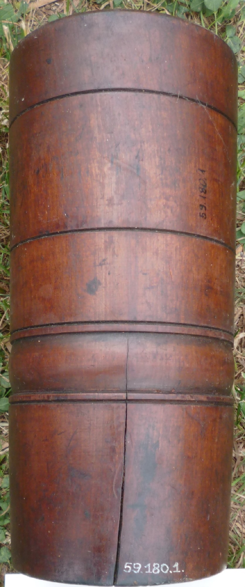 24.Holzmörser. Vor der Verbreitung von Mahlgeräten wurde alles, so auch Mohn, im Mörser zerkleinert.