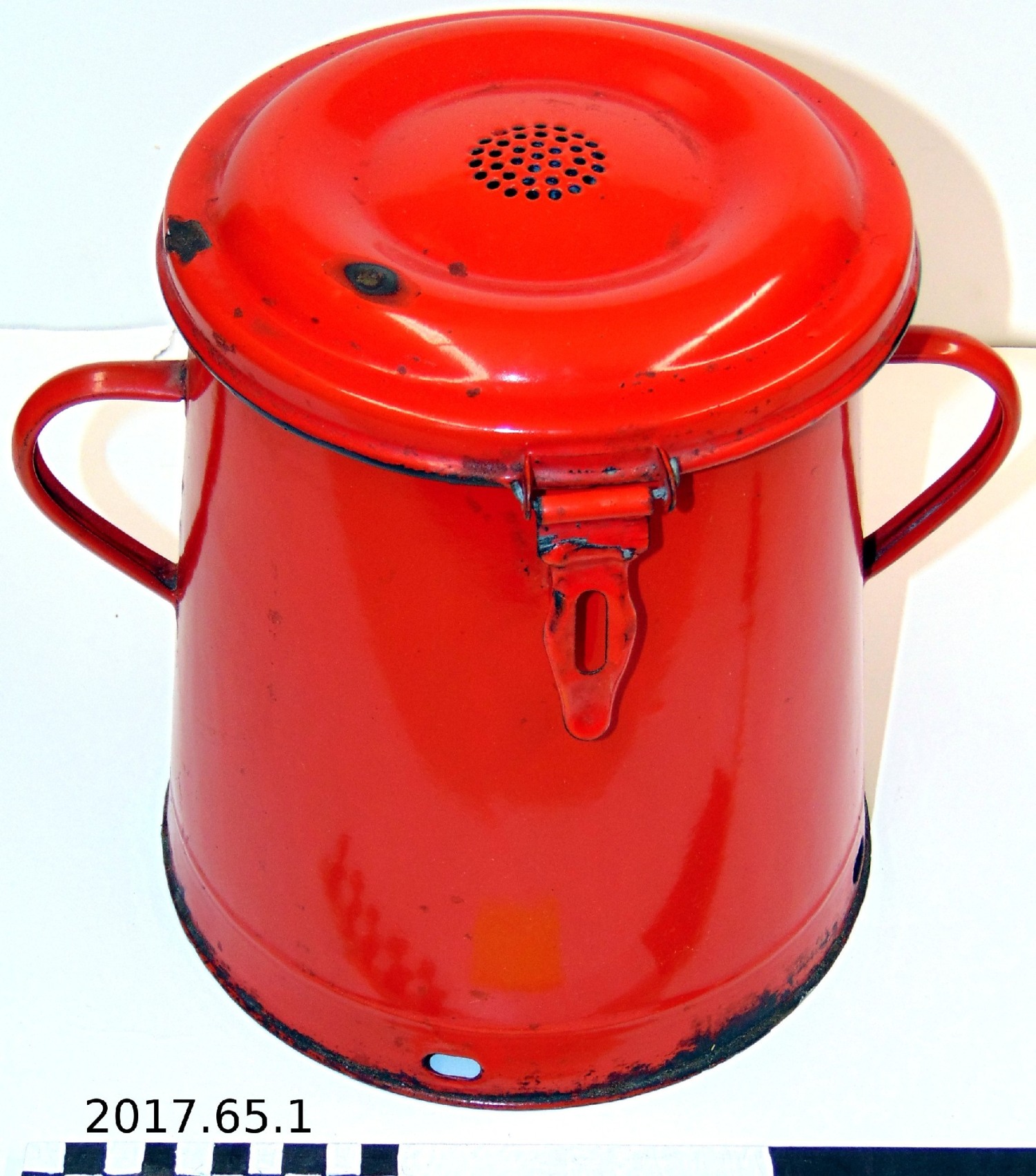 63. Fat-tub/firkin. Objects made of enamel and hard tiles on the “stelázsi” show a change in home culture in the 1940s and 1950s, when pottery products were displaced by factory products. There were two significant enamel factories in Hungary, the already closed one in Budafok and the one in Bonyhád that isstill operating today. The nearby Városlőd was the most famous for its hard tile production.