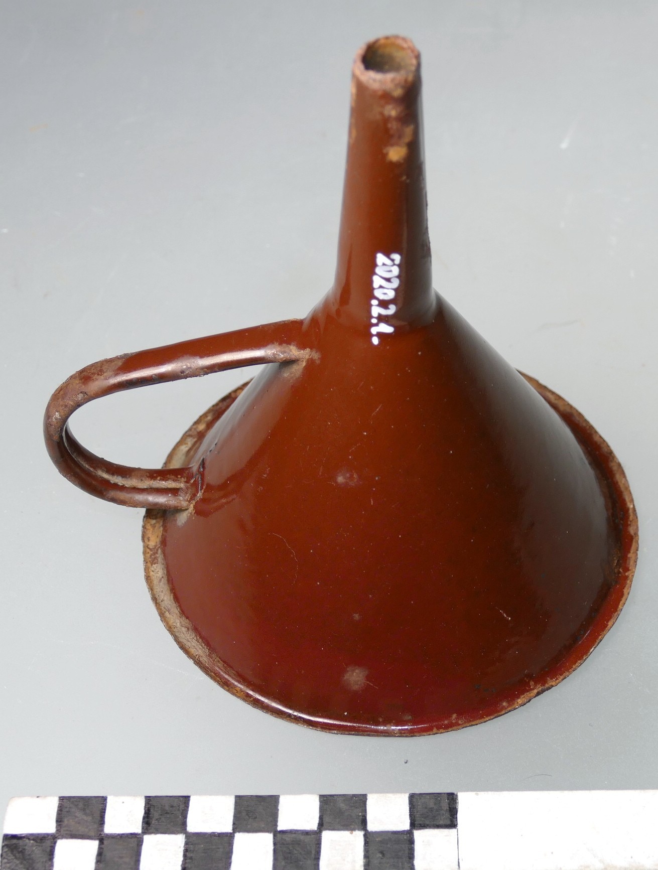 64.   Funnel. Objects made of enamel and hard tiles on the “stelázsi” show a change in home culture in the 1940s and 1950s, when pottery products were displaced by factory products. There were two significant enamel factories in Hungary, the already closed one in Budafok and the one in Bonyhád that isstill operating today. The nearby Városlőd was the most famous for its hard tile production.