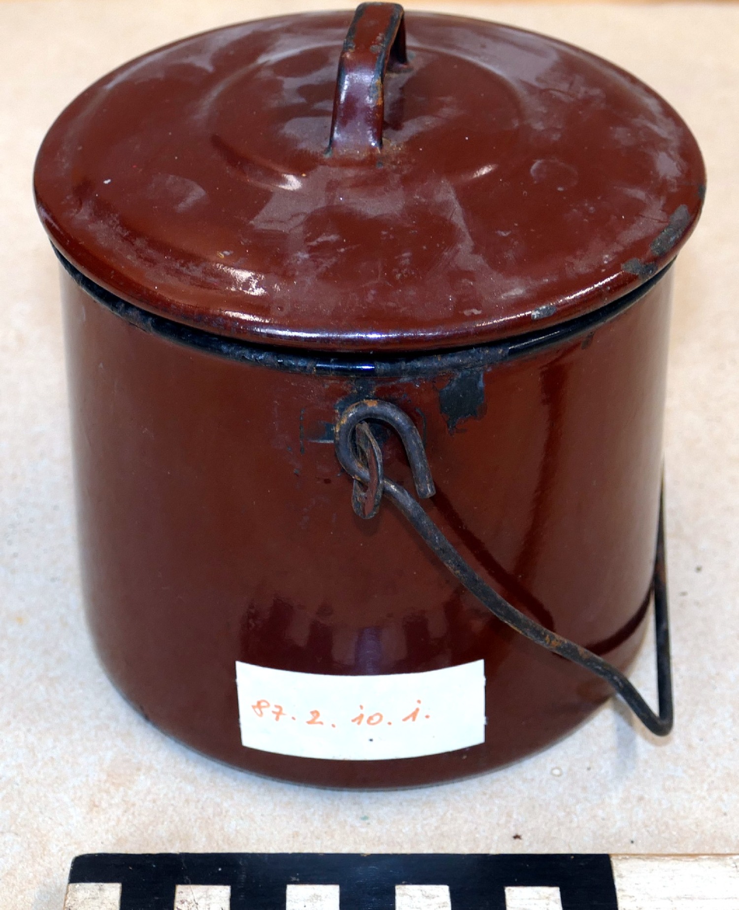 49. Lunchbox. Objects made of enamel and hard tiles on the “stelázsi” show a change in home culture in the 1940s and 1950s, when pottery products were displaced by factory products. There were two significant enamel factories in Hungary, the already closed one in Budafok and the one in Bonyhád that isstill operating today. The nearby Városlőd was the most famous for its hard tile production.