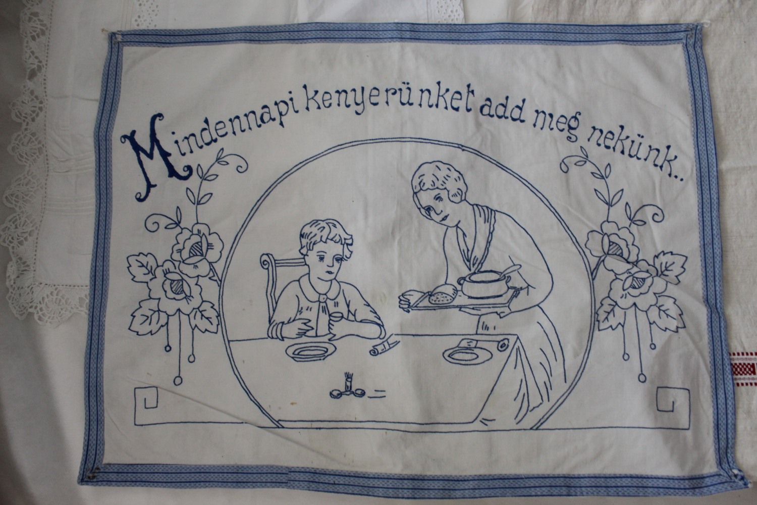 40. Wall-hanging: Thes type of textiles in the kitchen became widespread between the wars. Embroidered on them we can read moral foundations, a religious or love theme, or the praise of a hardworking housewife. Their use became possible with the advent of free-standing kitchens. They had a decorative role.