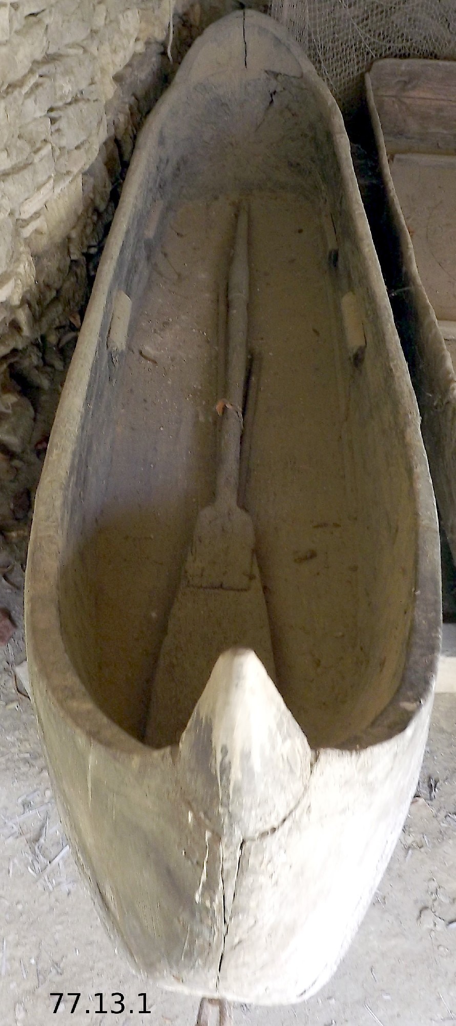 1. Barge. The barge carved from an oak tree is the ancient watercraft of Lake Balaton. It is a great rarity in collections, as it was replaced at the end of the 19th century by the so-called Komárom board-boats. Its widespread use in Transdanubia is evidenced by a newspaper article published in the Veszprémi Napló in the 1960s, which reports that one of the blades got stuck in an interesting piece of wood during reaping in the meadows around Várpalota. The staff of the Bakony Museum (the predecessor of the Dezső Laczkó Museum) at that time lifted an almost intact barge from the former lake, which had become a meadow.