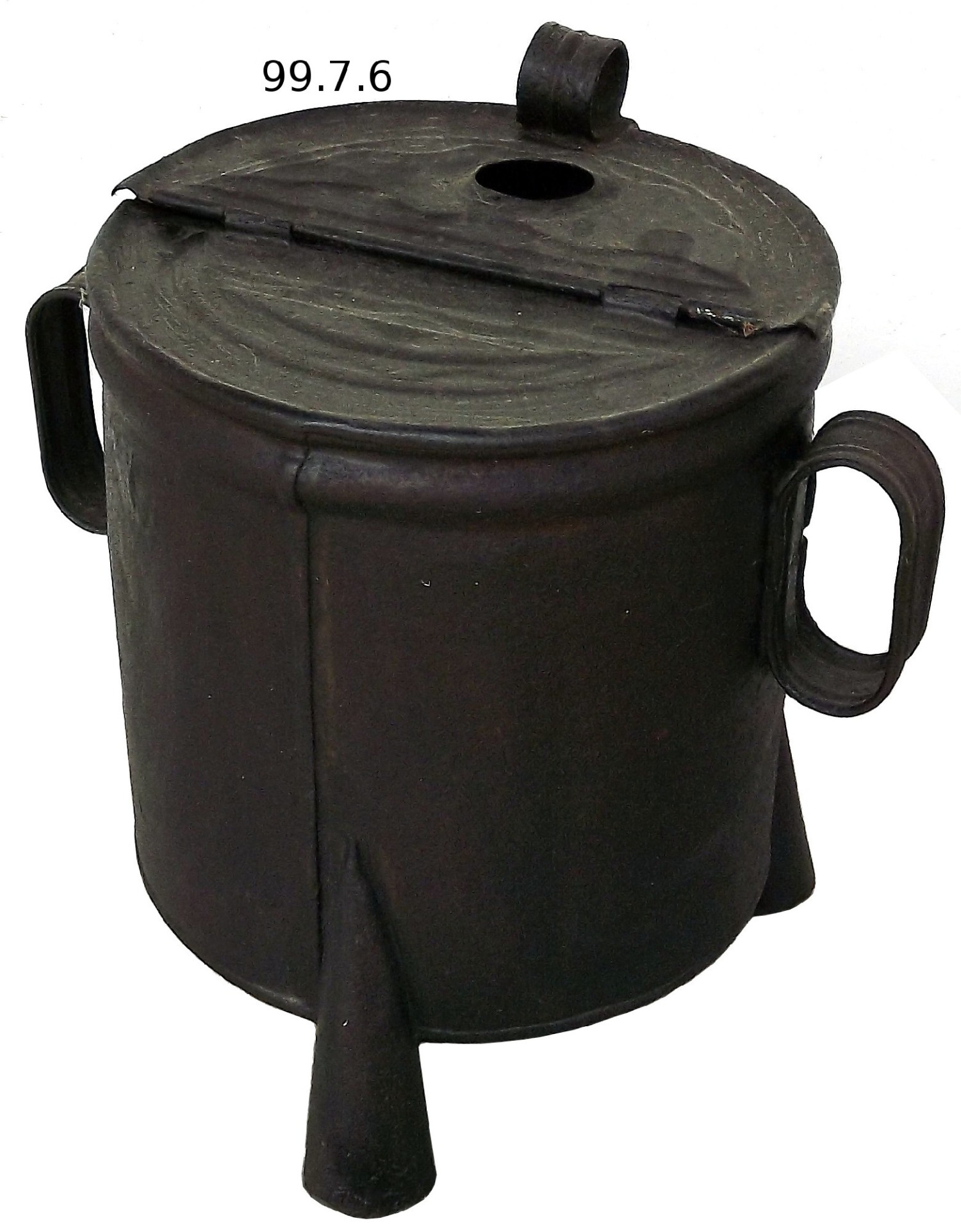 62. Fat tub / firkin. A container made of sheet metal in the workshop of a village handyman.