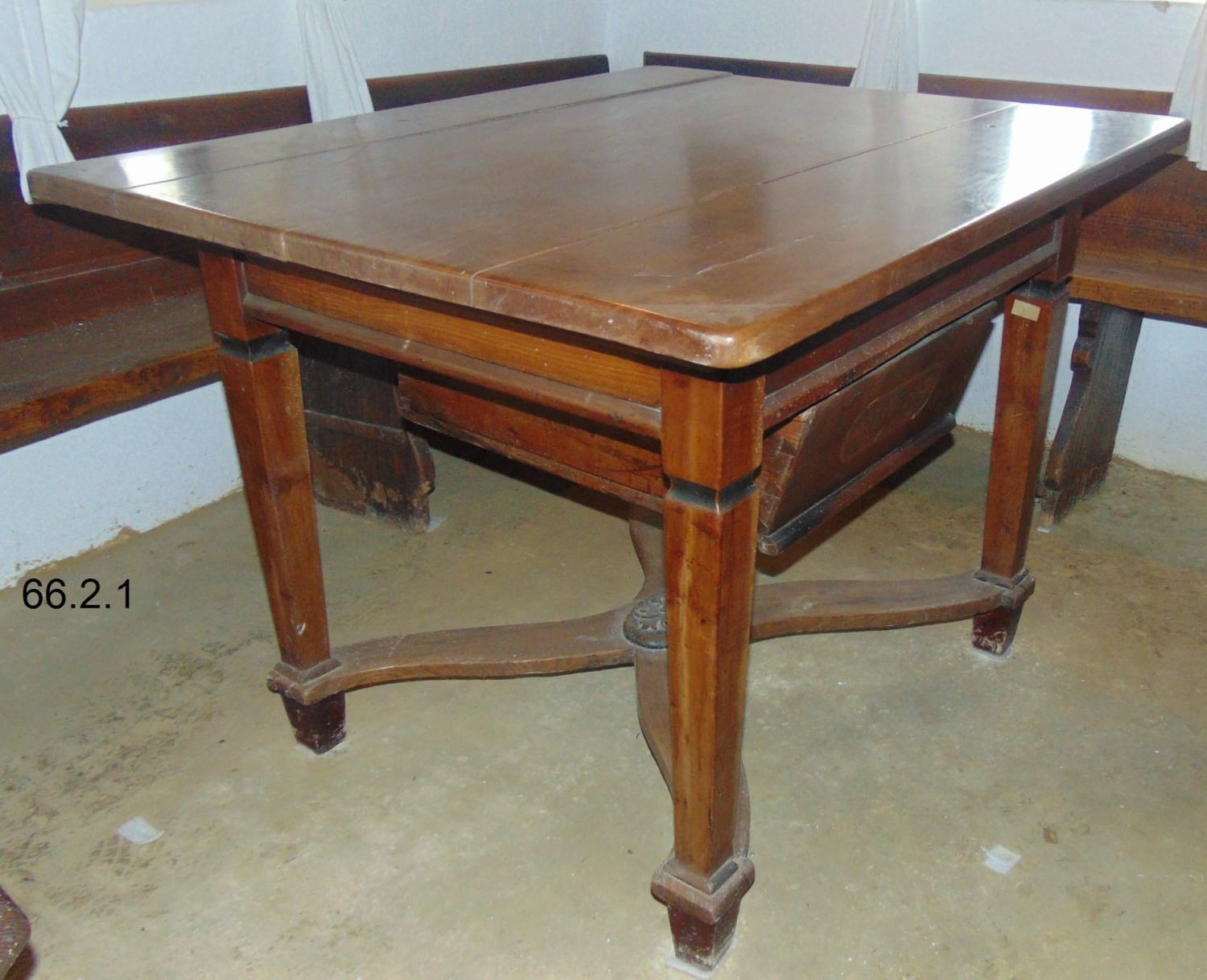 9. Asztal. Faberakással díszített asztalosmunkák. A faberakásnál a minta helyét kivésték, abba került bele az eltérő színű faanyag, míg az intarziánál egymás fölé helyezett falapokkal érték el a kívánt hatást. Az asztal fiókját úgy képezték ki, hogy benne elférjen az akár három kilós megszegett kenyér is. Az asztal a körülötte lévő sarokpaddal a ház központi részét alkotta. Főként ünnepi alkalmakkor itt étkezett a család, az asztalra állították fel a karácsonyfát, valamint a céhgyűlés is e körül zajlott.